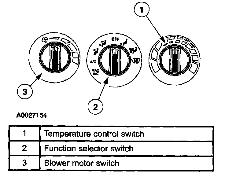The manual climate control system heats or cools the vehicle interior depending on the position of the function selector switch and the temperature selected. The position of the function selector switch determines heating or cooling and air distribution. The temperature control setting determines air temperature.