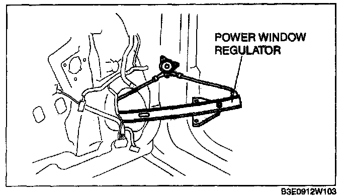 5. Remove the front power window regulator through the speaker installation hole.