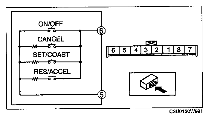 5. Inspect for resistance and continuity between cruise control switch terminals 5-6 using a tester.