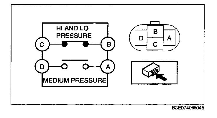 3. Verify the high-pressure side reading of the SST (manifold gauge) and continuously between the refrigerant pressure switch terminals B and C, A and D.