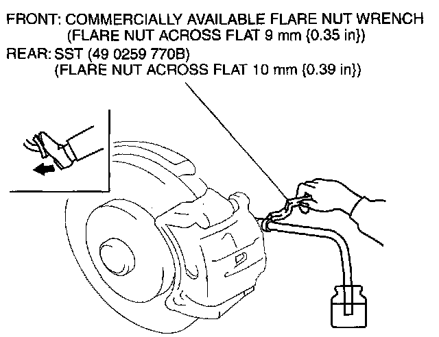 4. While the brake pedal is depressed, the other should loosen the bleeder screw using the SST or any commercially available flare nut wrench, drain out any fluid containing air bubbles, and tighten the bleeder screw.