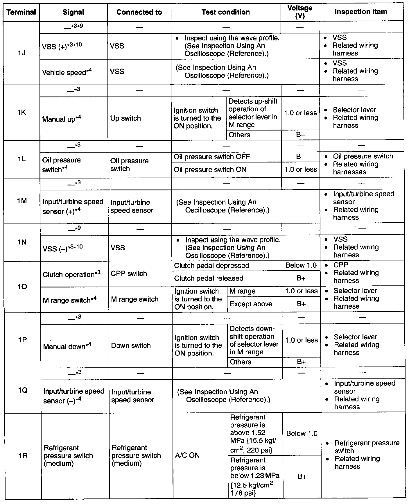 PCM Terminal Voltage Table (Reference) - Terminals (1J - 1R):