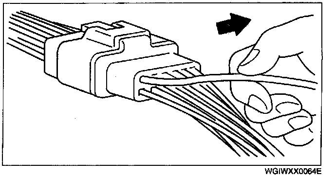 - Insert a thin piece of metal from the terminal side of the connector and with the terminal locking tab pressed down, pull the terminal out from the connector.