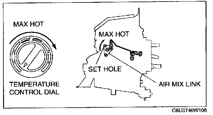 2. Set the air mix link to max hot in the direction shown by the arrow and insert a screwdriver at the set hole.