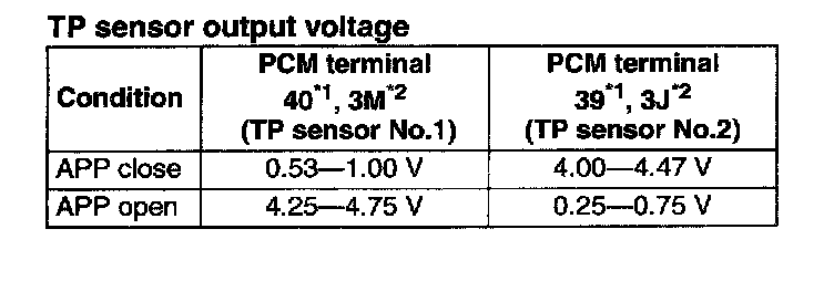 4. Verify that the PCM terminal 39*1, 3J*2 and 40*1, 3M*2 change smoothly while throttle valve is gradually opened.