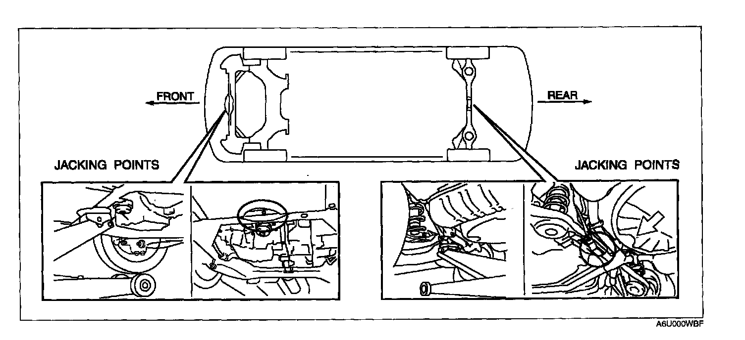 JACKING POSITIONS, VEHICLE LIFT (2 SUPPORTS) AND SAFETY STAND (RIGID RACK) POSITIONSJacking Positions
