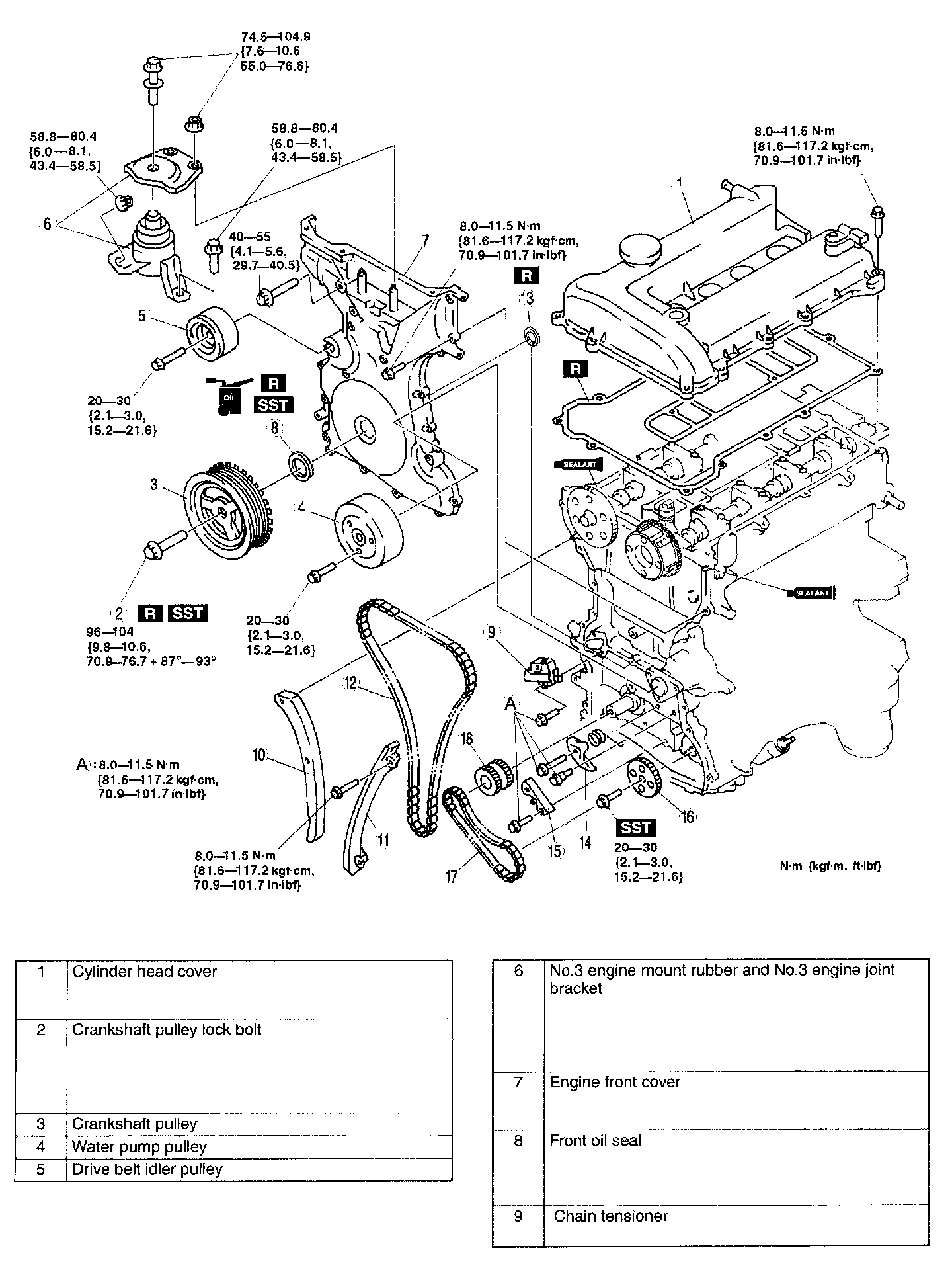 Tighten to 14 - 17 Nm (1.5 - 1.7 kgf-cm, 10.4 - 12.5 ft. lbs.)