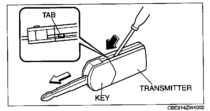 1. Insert a small screwdriver into the slot and push the tab to remove the key from the transmitter.