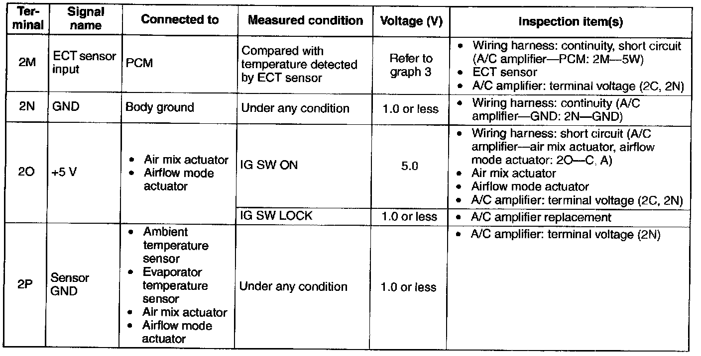 3. By inserting the positive (+) lead of the tester into each A/C amplifier terminal, measure the voltage according to the terminal voltage table.