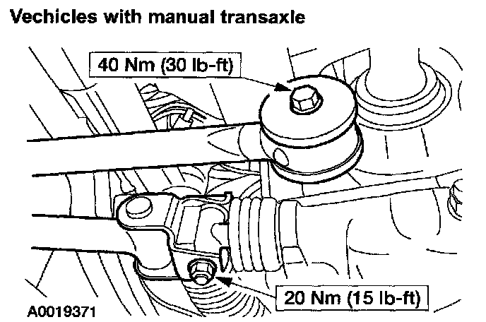 15. Remove the two bolts and disconnect the manual transaxle shift linkage.