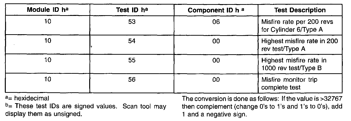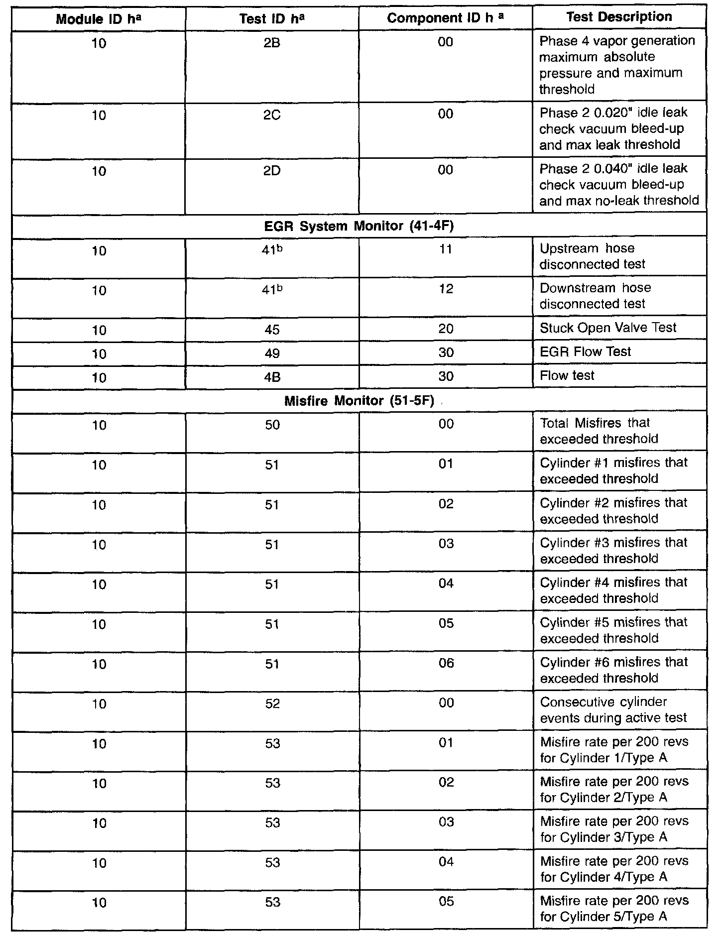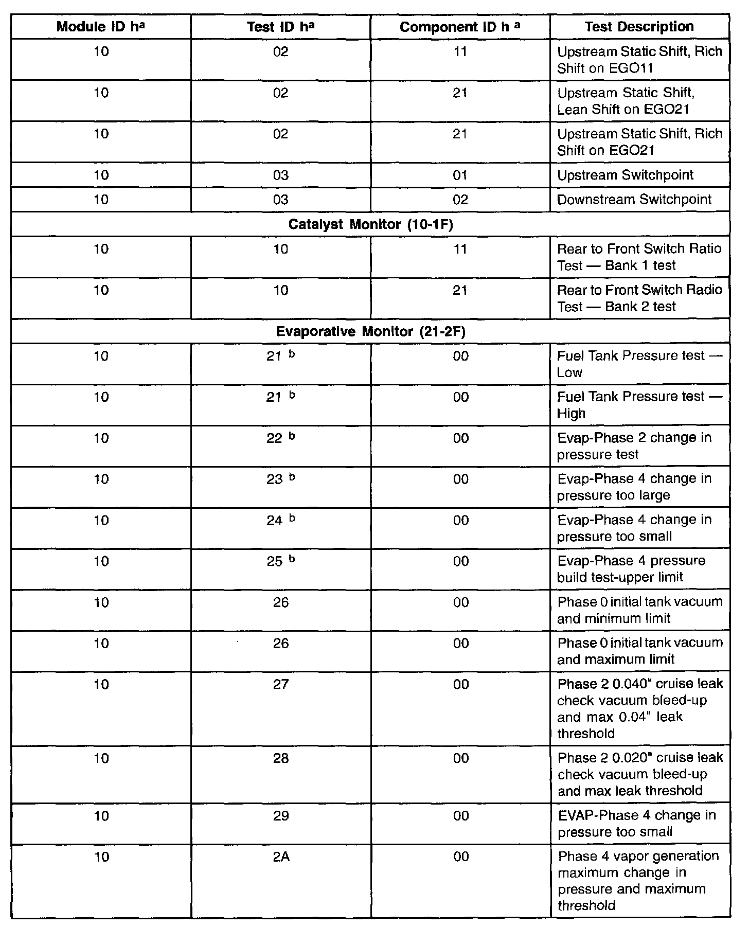 The purpose of this test mode is to allow access to the results of OBD II monitor diagnostic test results. The test values that are stored at the time of the particular monitor completion are displayed when the particular test identification is requested. See the table for test information.