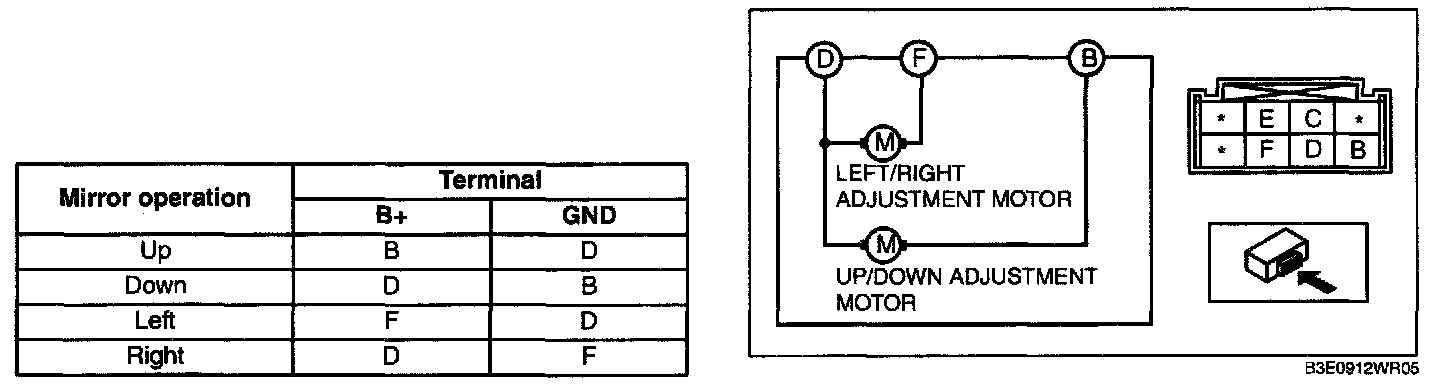 1. Apply battery positive voltage to the power outer mirror terminals and inspect the operation of the power outer mirror.