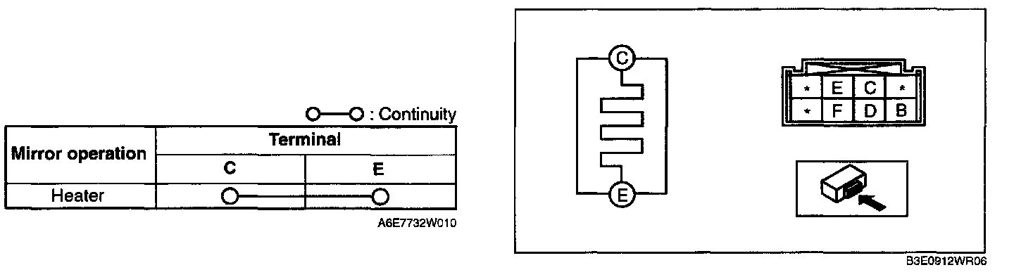 2. Inspect for continuity between the power outer mirror heater terminals.