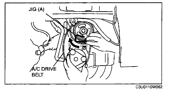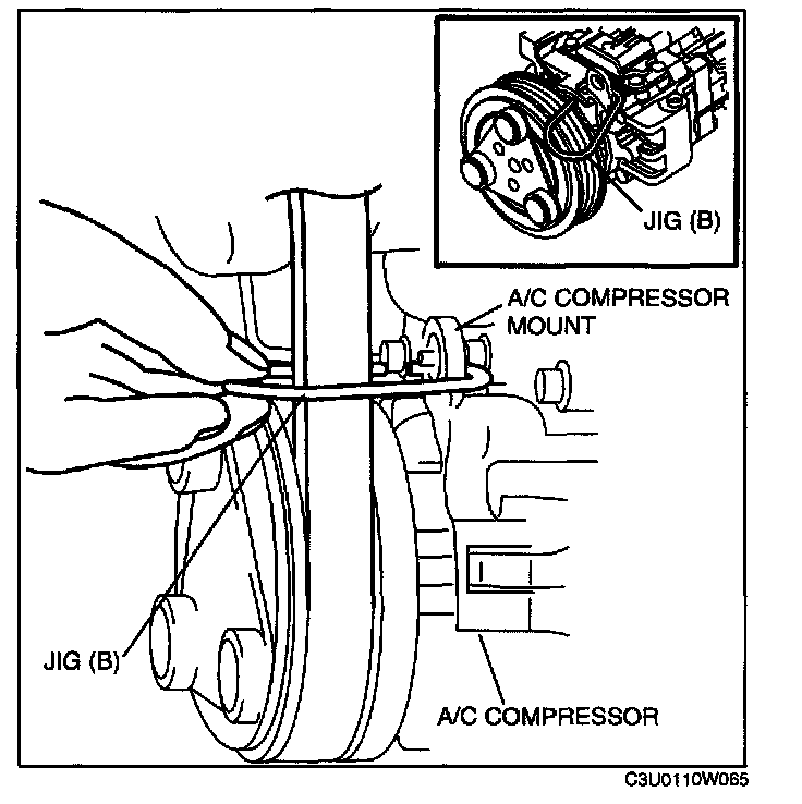 - Do not pass jig (B) through the A/C compressor mount hole.