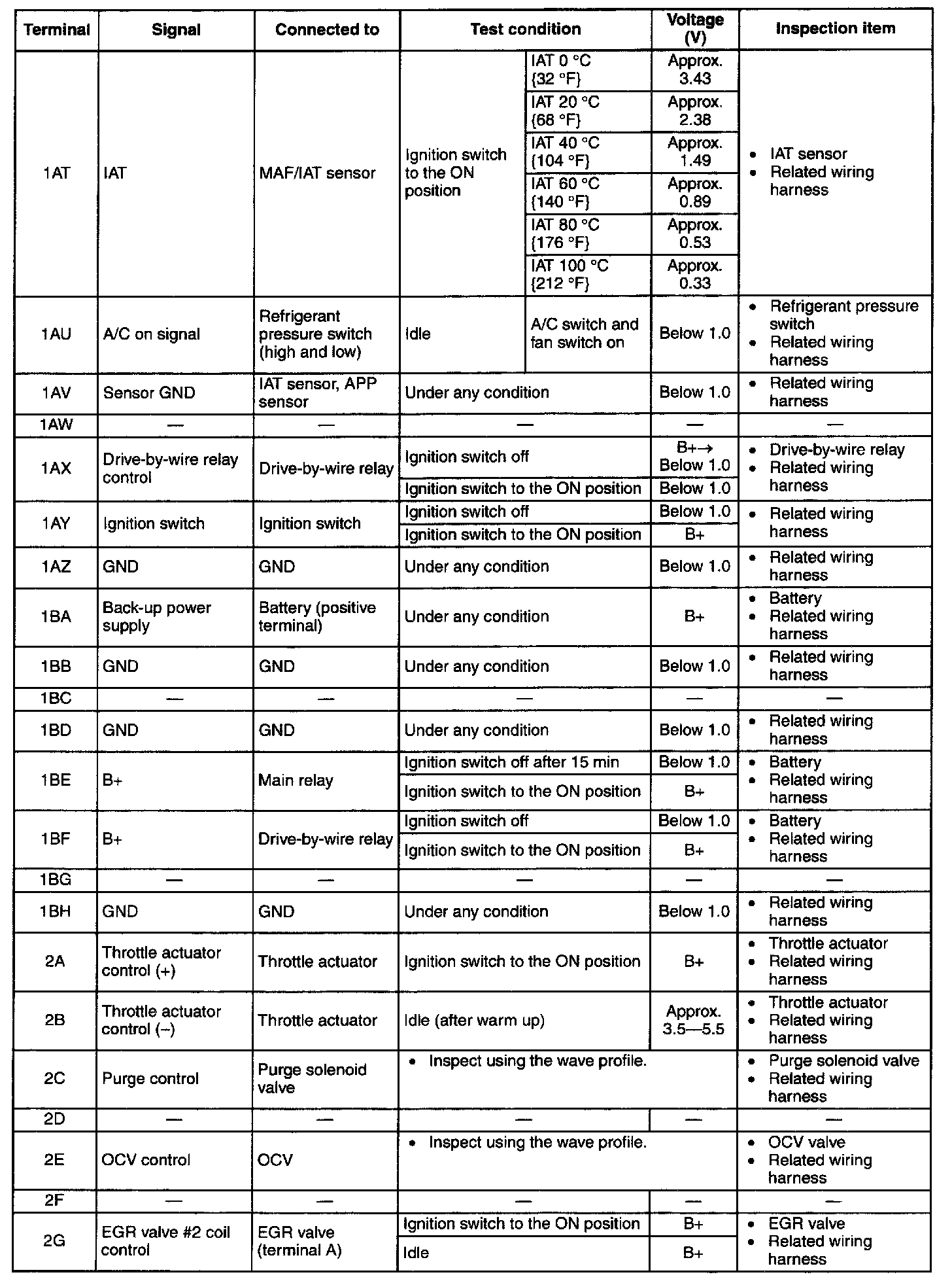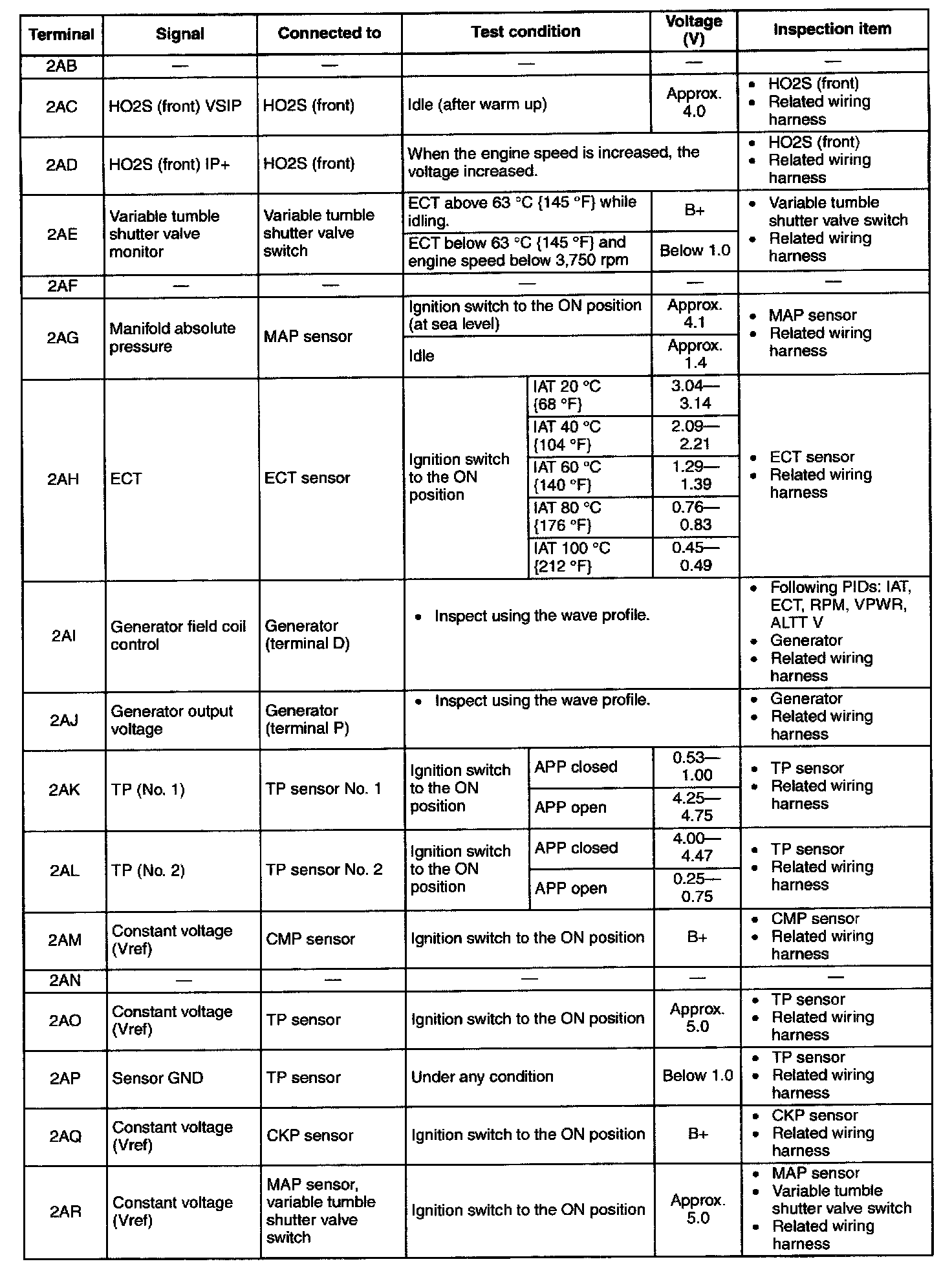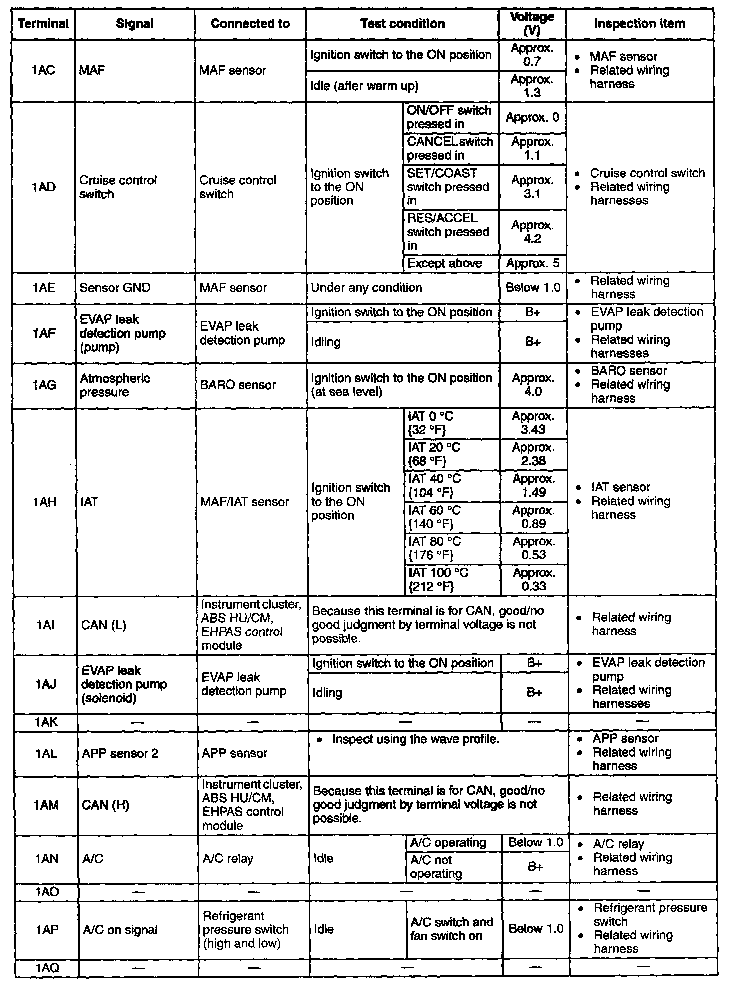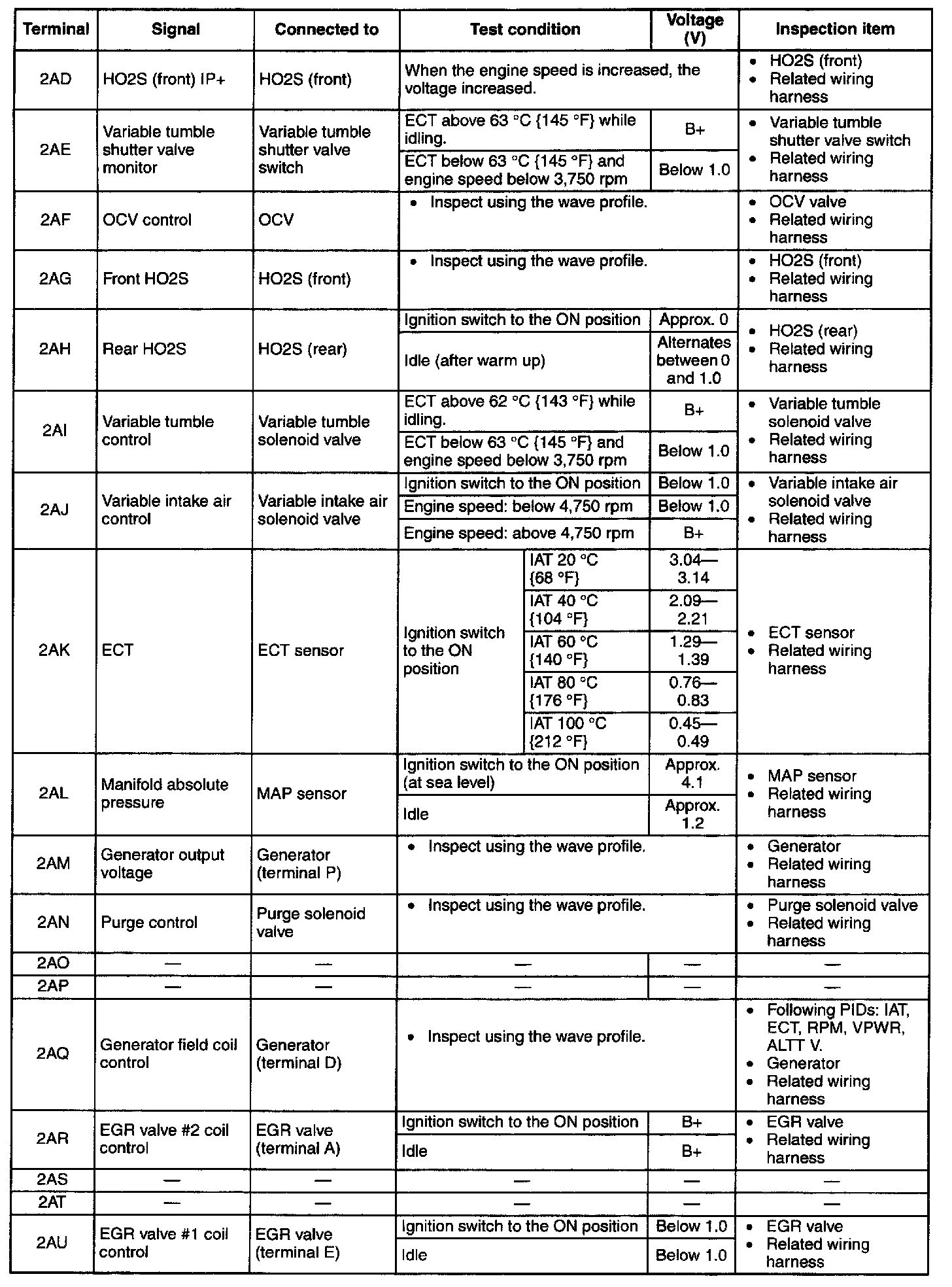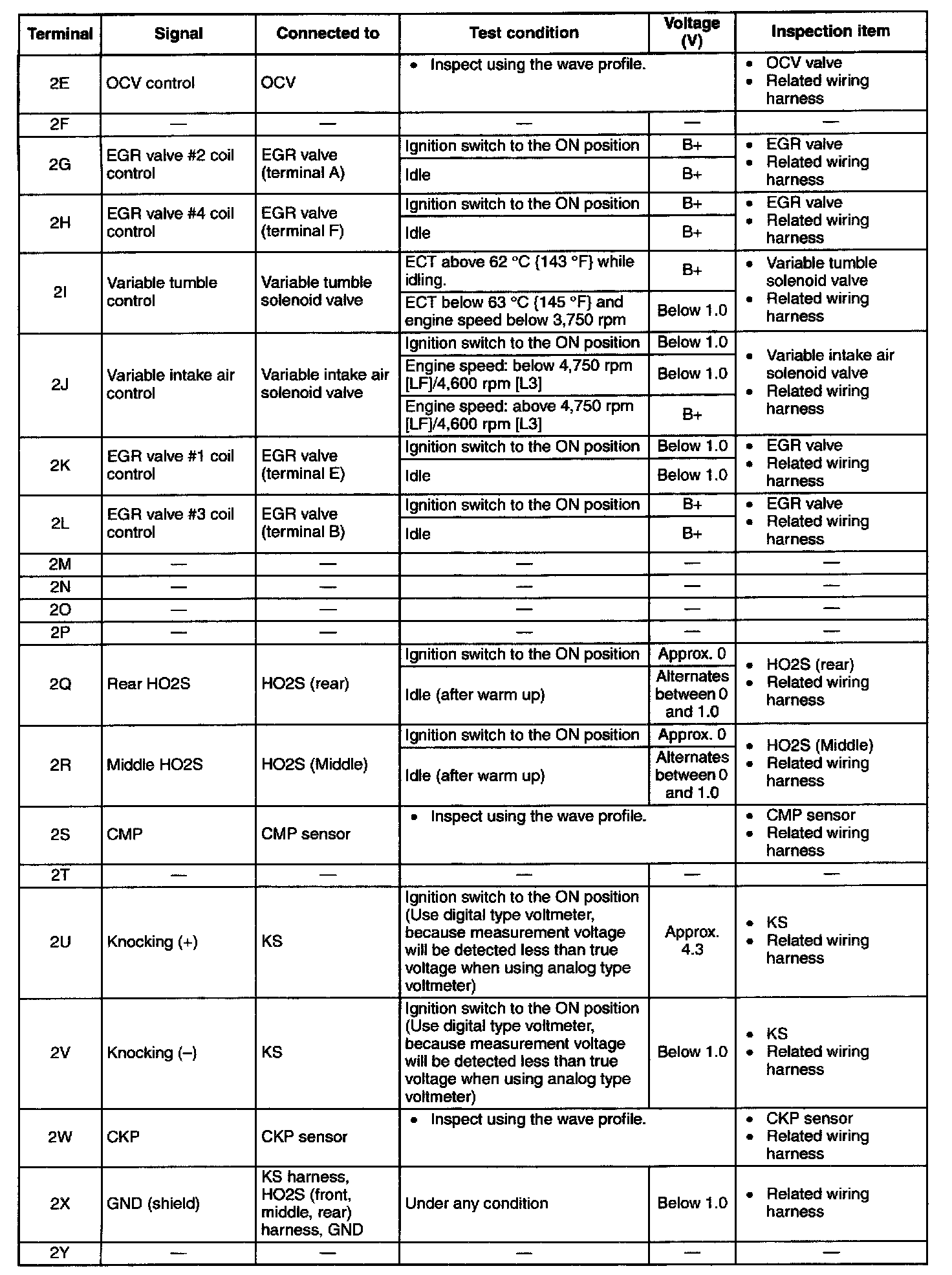 NOTE: The PCM terminal voltage can vary with the conditions when measuring and changes due to aged deterioration on the vehicle, causing false diagnosis. Therefore determine comprehensively where the malfunction occurs among the input systems, output systems, and the PCM.