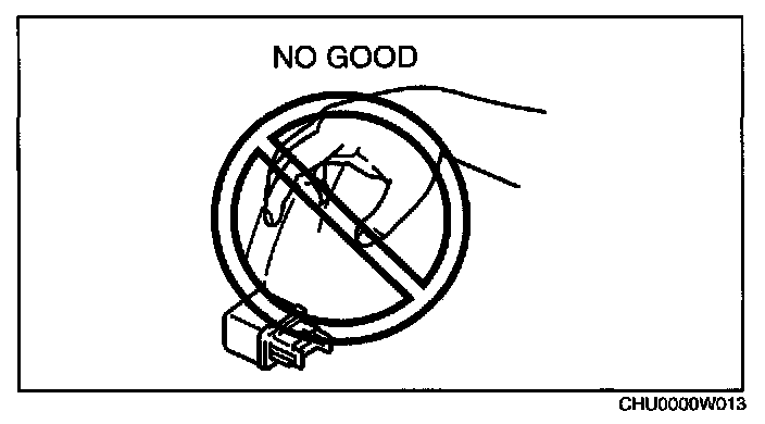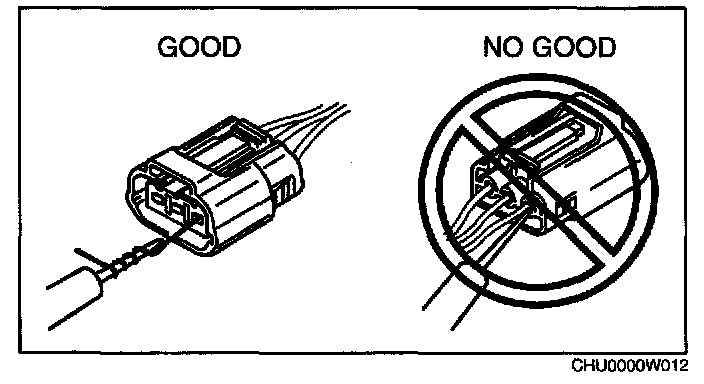 - When a tester is used to inspect for continuity or measuring voltage, insert the tester probe from the wiring harness side.