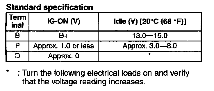 [Ambient temp. 20 °C (68 °F), voltage 13.0 - 15.0 V, both engine and generator are hot]