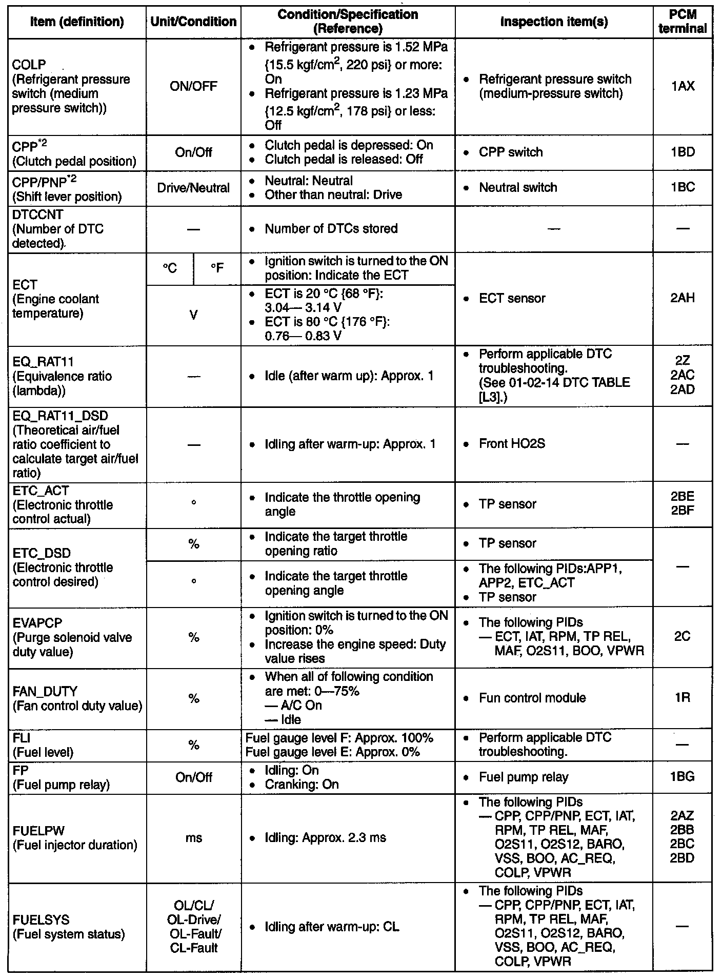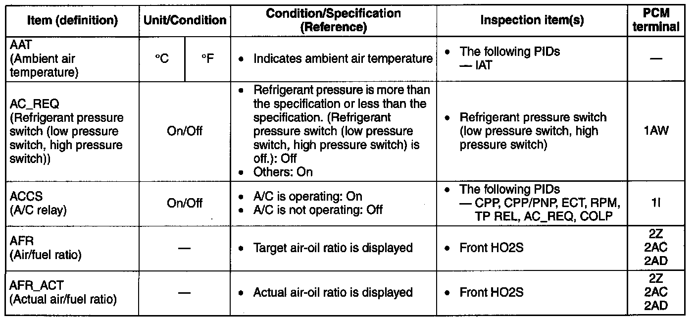 - The PID/DATA MONITOR function monitors the calculated value of the input/output signals in the PCM. Therefore, an output device malfunction is not directly indicated as a malfunction of the monitored value for the output device. If a monitored value of an output device is out of specification, inspect the monitored value of the input device related to the output control.