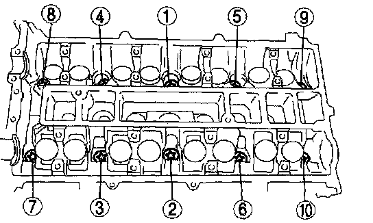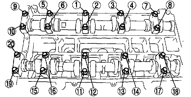 Tighten the camshaft cap bolts in the order shown with the following two steps.