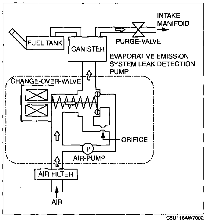 - The EVAP system test finds gas leaks in the system using the PCM to monitor changes in the air pump load current of the EVAP system leak detection pump. This test starts after sending an on-demand test signal from the WDS to the PCM. The PCM controls the air pump and change-over-valve operation and also stores the load current of the air pump as follows:
