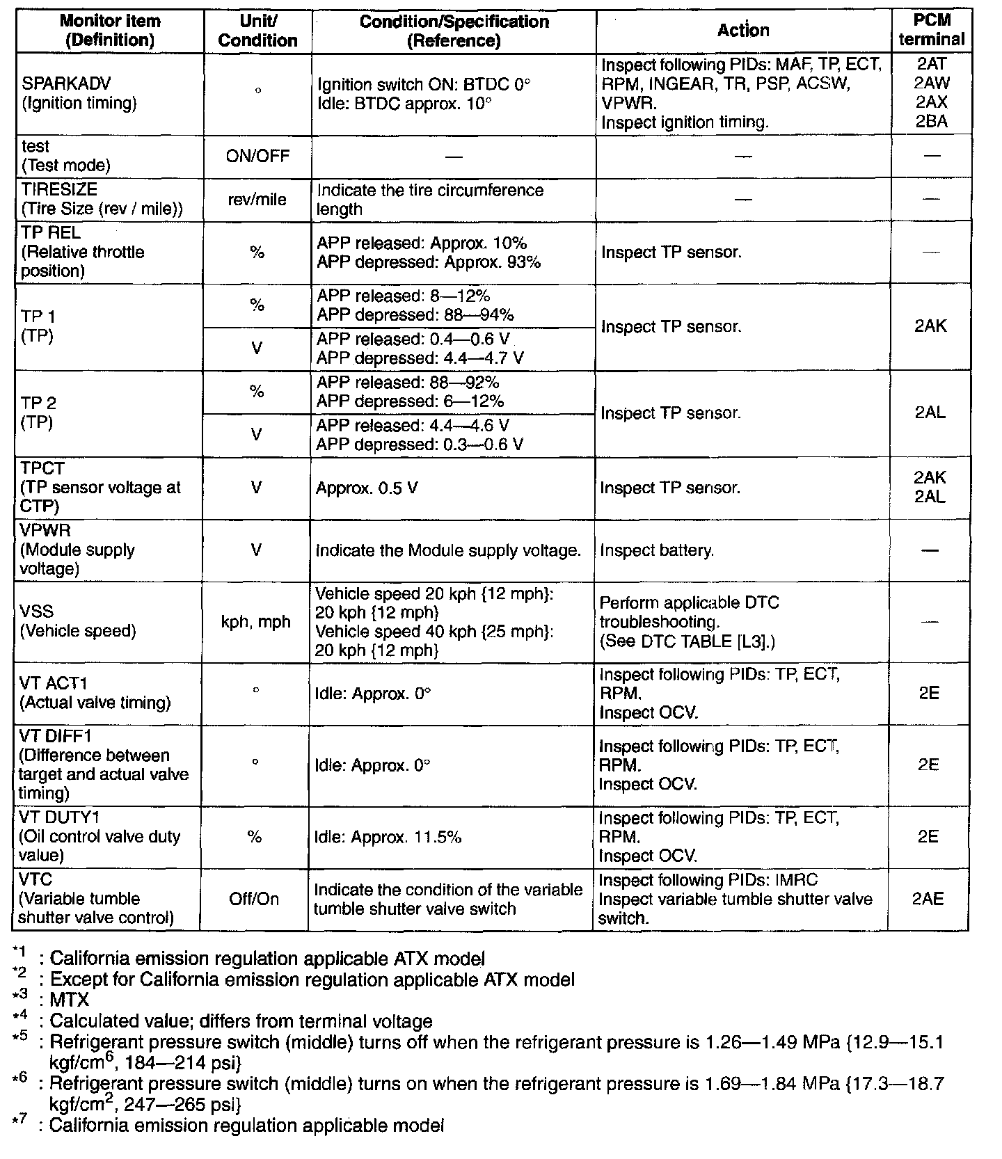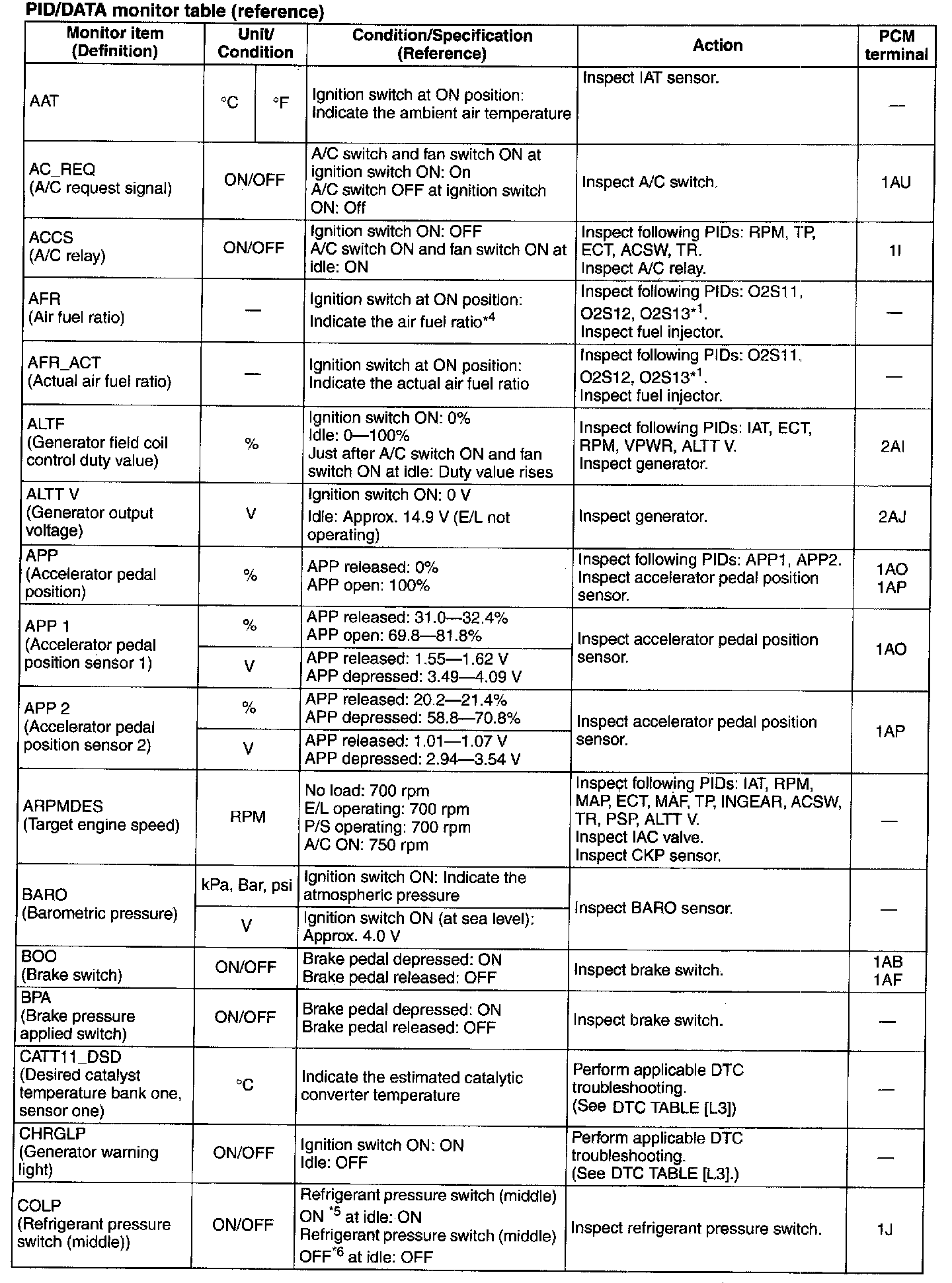 PID/DATA Monitor Table (Reference)