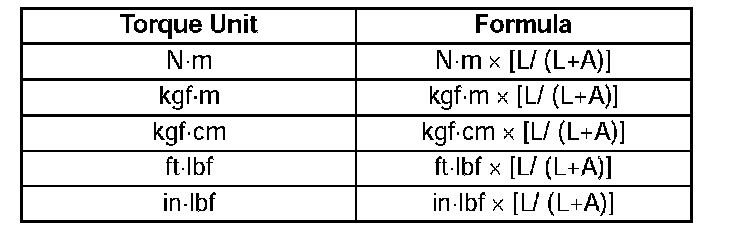 ^ When using a torque wrench-SST or equivalent combination, the written torque must be recalculated due to the extra length that the SST or equivalent adds to the torque wrench. Recalculate the torque by using the following formulas. Choose the formula that applies to you.