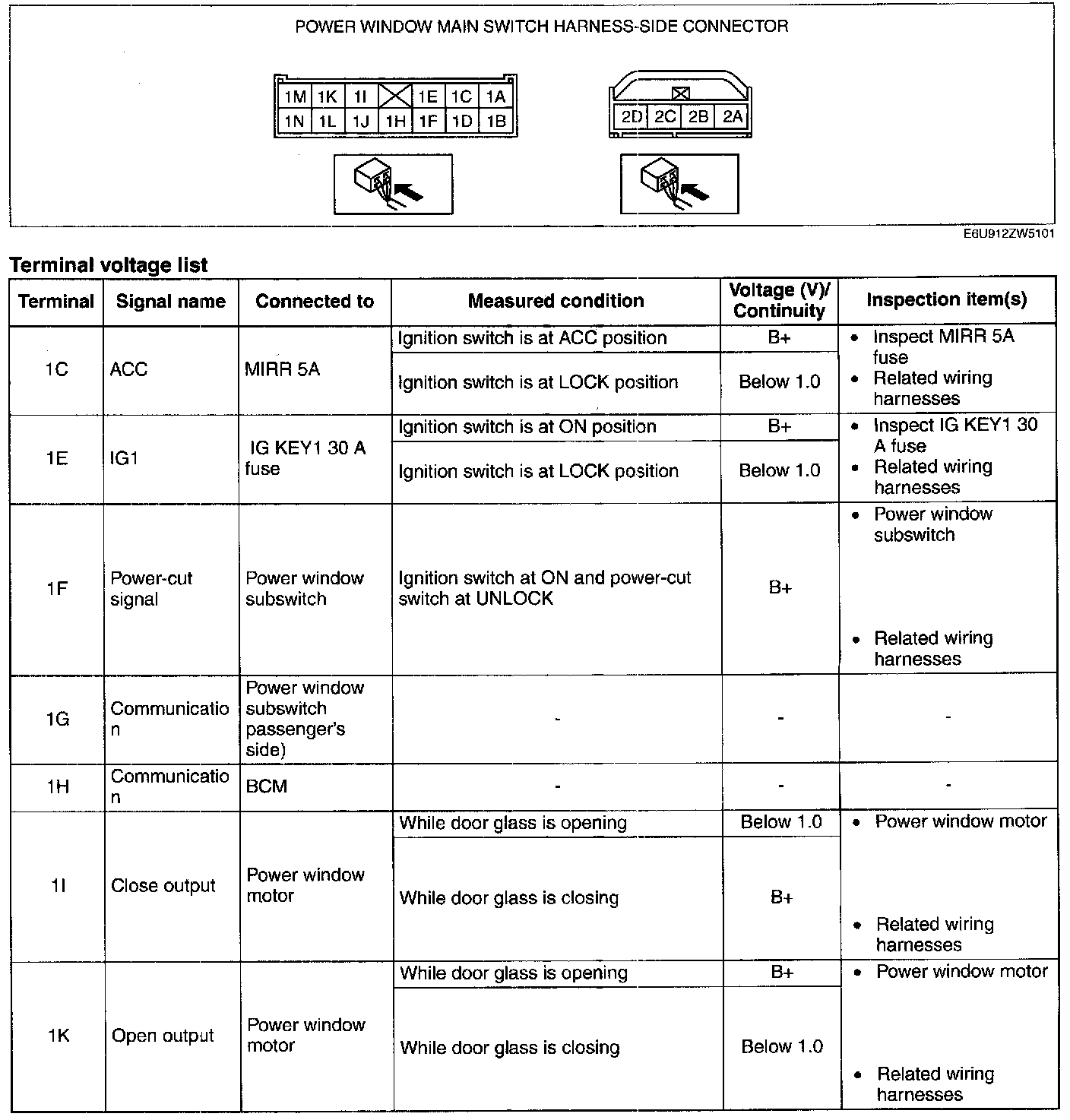 POWER WINDOW MAIN SWITCH INSPECTIONNOTE: Before proceeding with diagnosis of malfunctioning power windows, ensure the POWER WINDOW INITIALIZATION PROCEDURE has been performed.