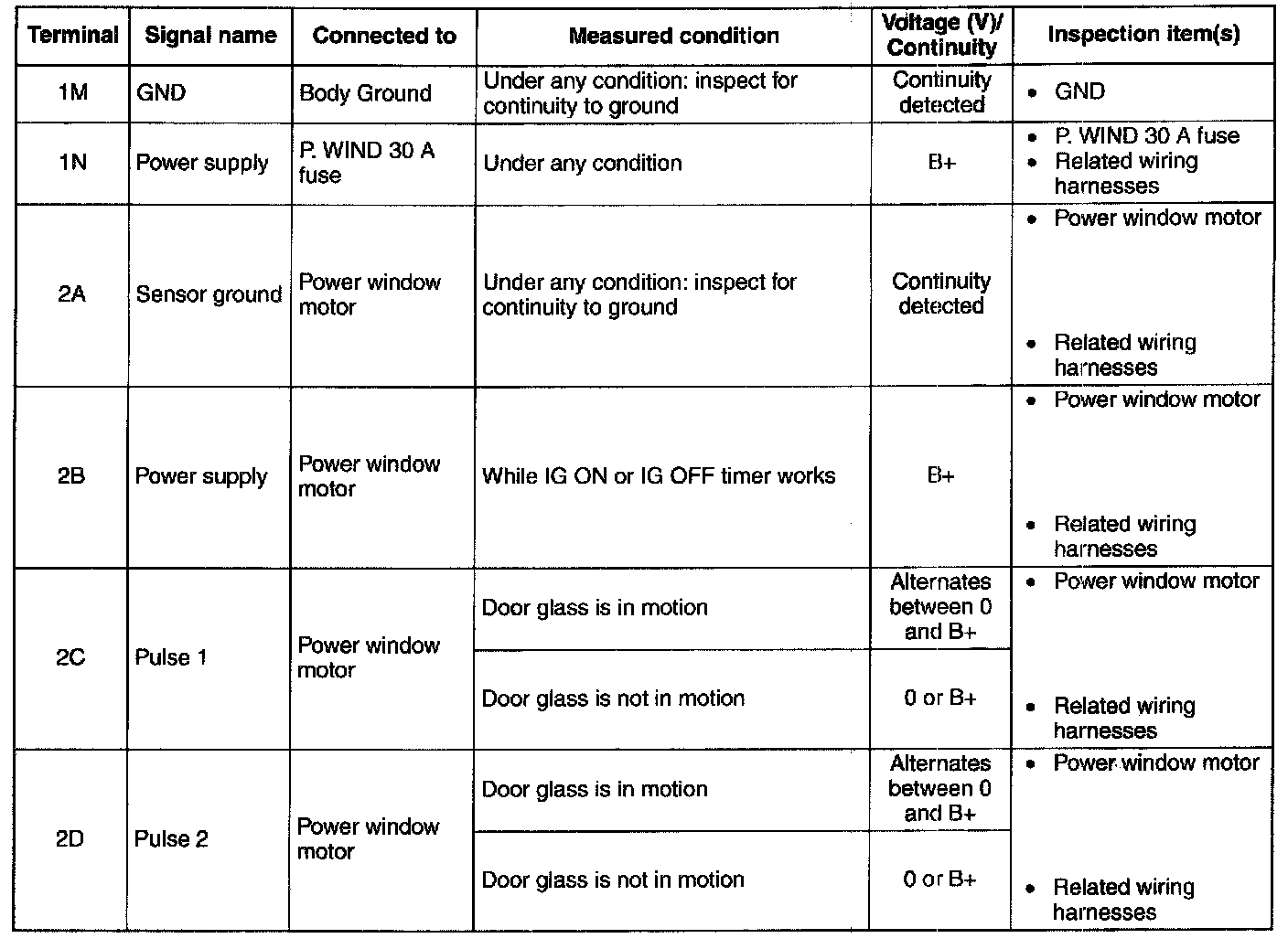 3. Inspect the power window main switch connector for continuity at terminal 1 M and 2A.