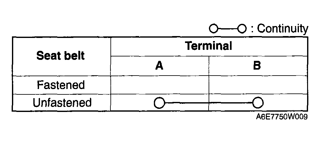 - Inspect for continuity between the buckle switch terminals using a tester.