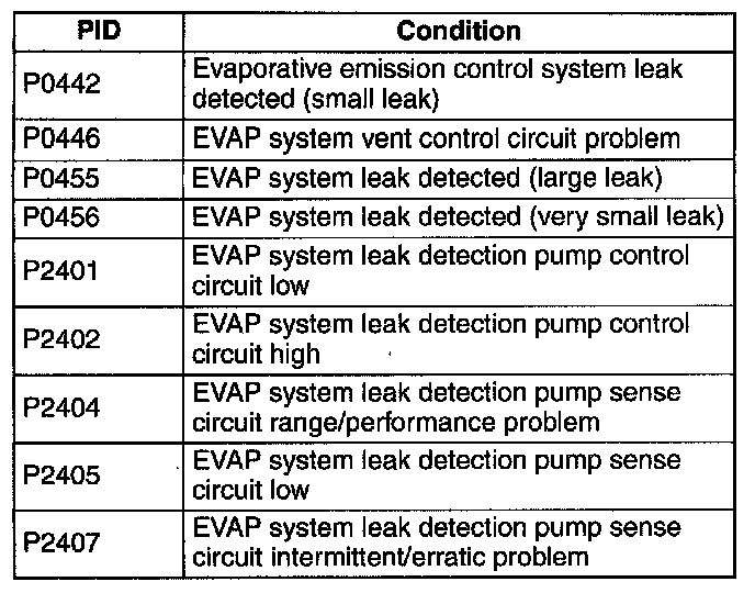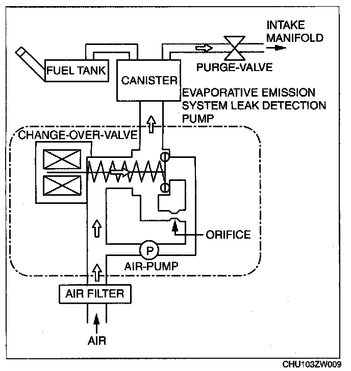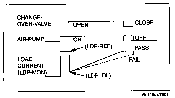 - The EVAP system test finds gas leaks in the system using the PCM to monitor changes in the air pump load current of the EVAP system leak detection pump. This test starts after sending an on-demand test signal from the M-MDS to the PCM. The PCM controls the air pump and change-over-valve operation and also stores the load current of the air pump as follows:
