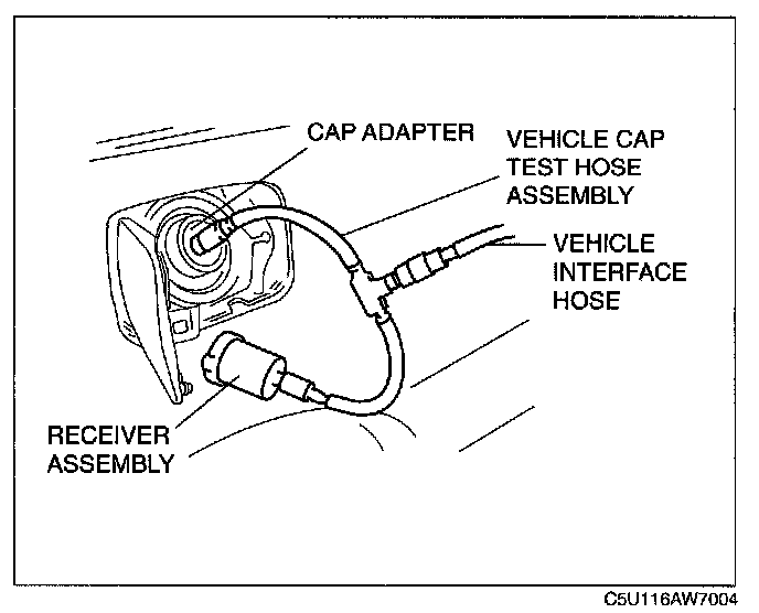 3. Connect the receiver assembly (SST: 134- 01059) to the vehicle cap test hose assembly (part of the SST) and the fuel-filler cap from the vehicle.