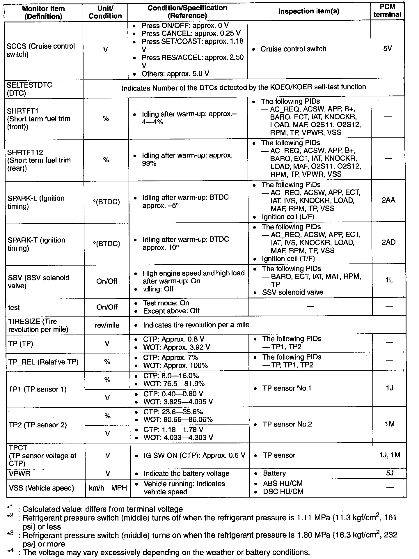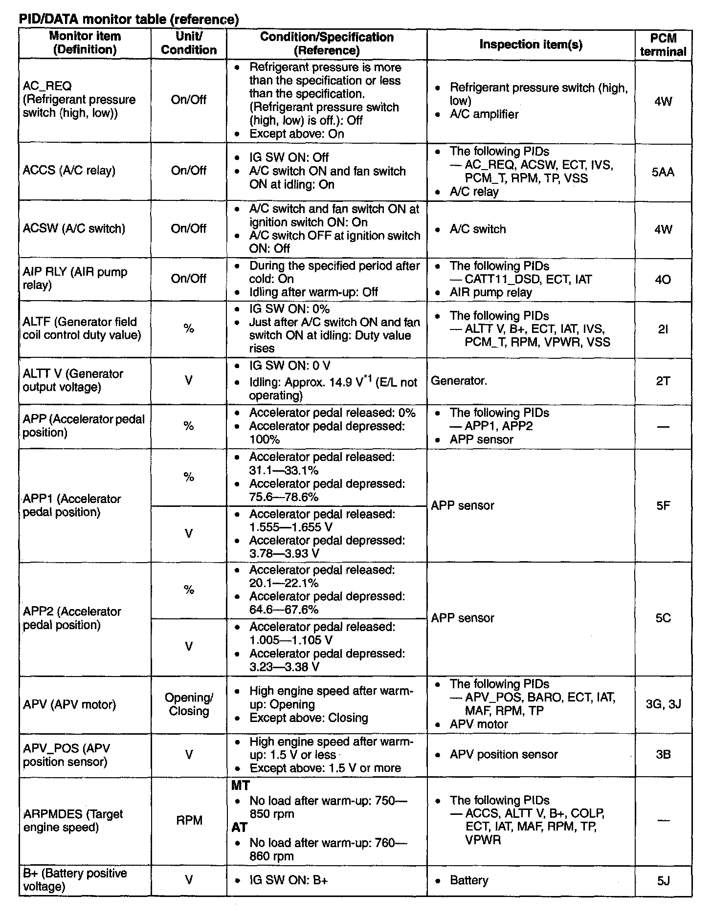 PID/DATA Monitor Table (Reference)