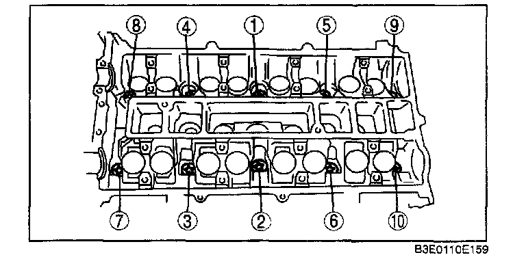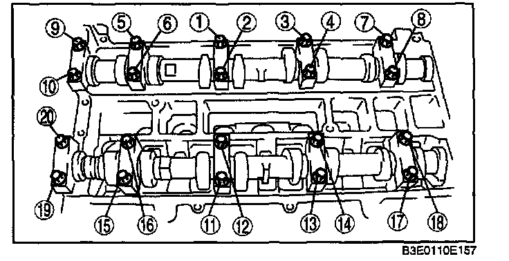 Tighten the camshaft cap bolts in the order shown with the following two steps.