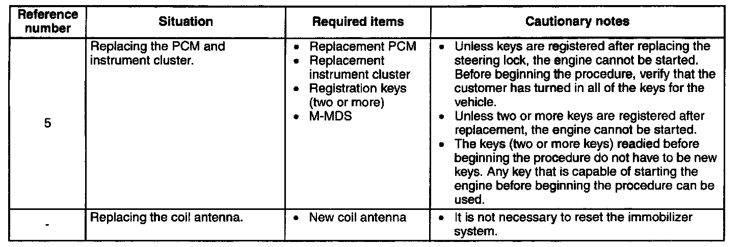 - When performing the following procedures, the immobilizer resetting procedure using the M-MDS must also always be performed: "instrument cluster replacement", "P CM replacement", "instrument cluster and PCM joint replacement", "Key ID number clearing". The engine will not start unless all work is performed using the M-MDS.