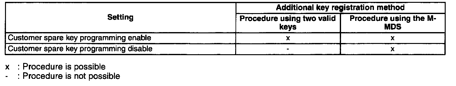 - By disabling the "No.1 Additional Key Registration Procedure (Using Two Valid Keys)", only the M-MDS can be used to register additional keys, thereby preventing two valid keys from being used to create an unauthorized spare key. This function is for use by rental car or other companies with vehicle fleets.