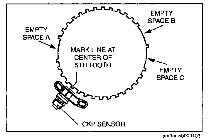 2. Fit the center of the CKP sensor with the fifth tooth (counting counterclockwise from the empty space A as shown in the figure) of the pulse wheel.