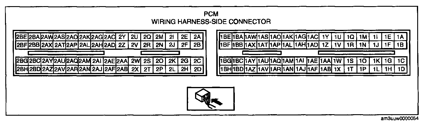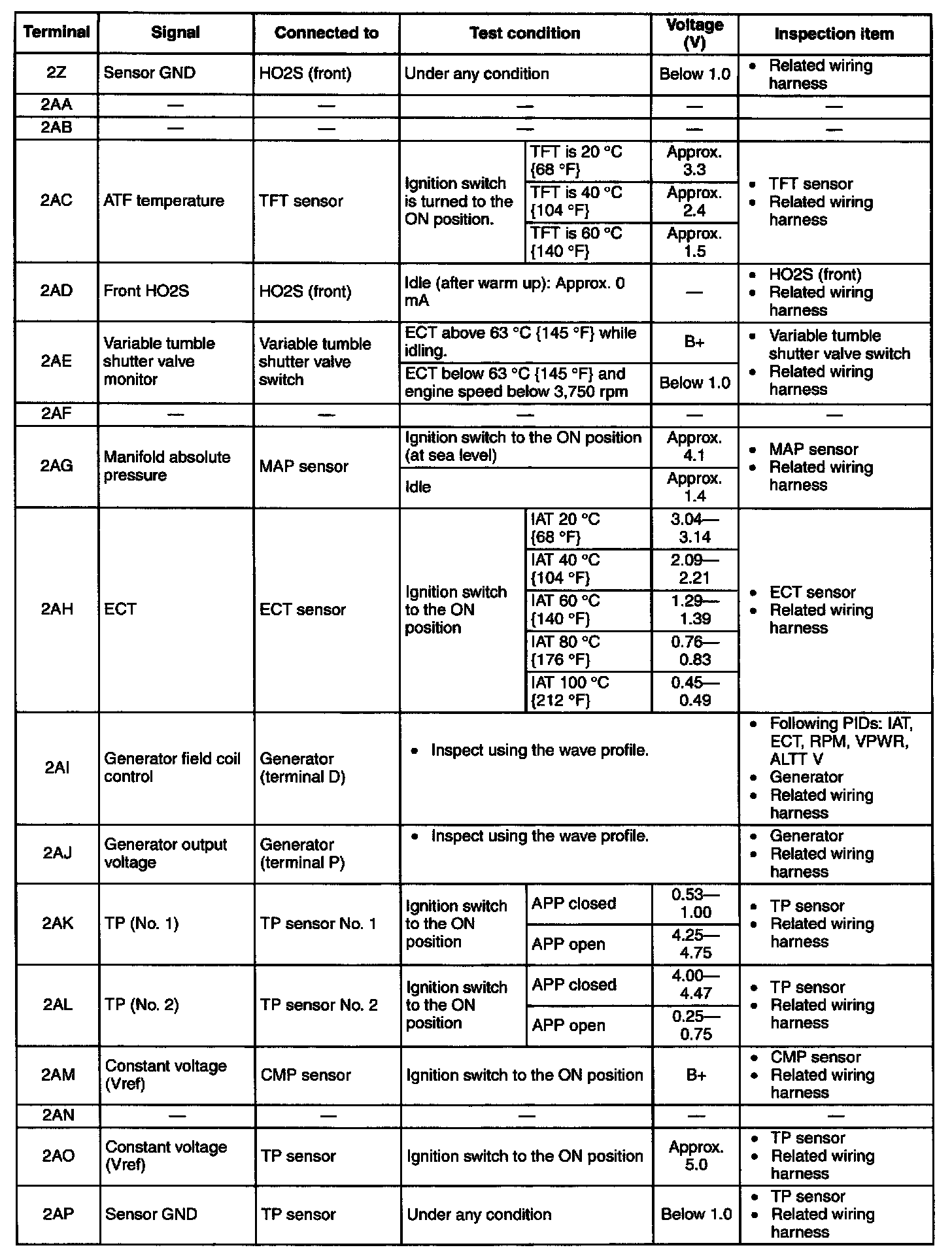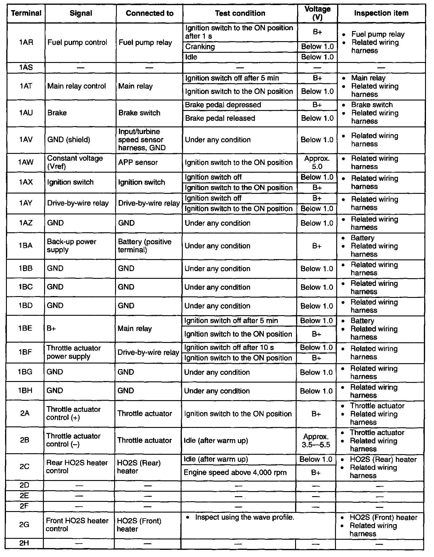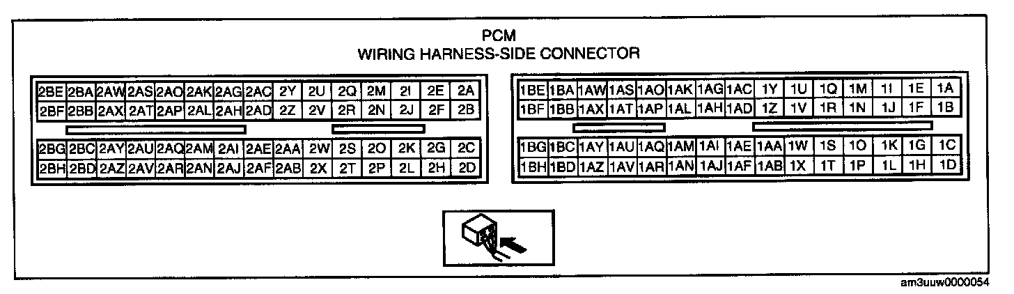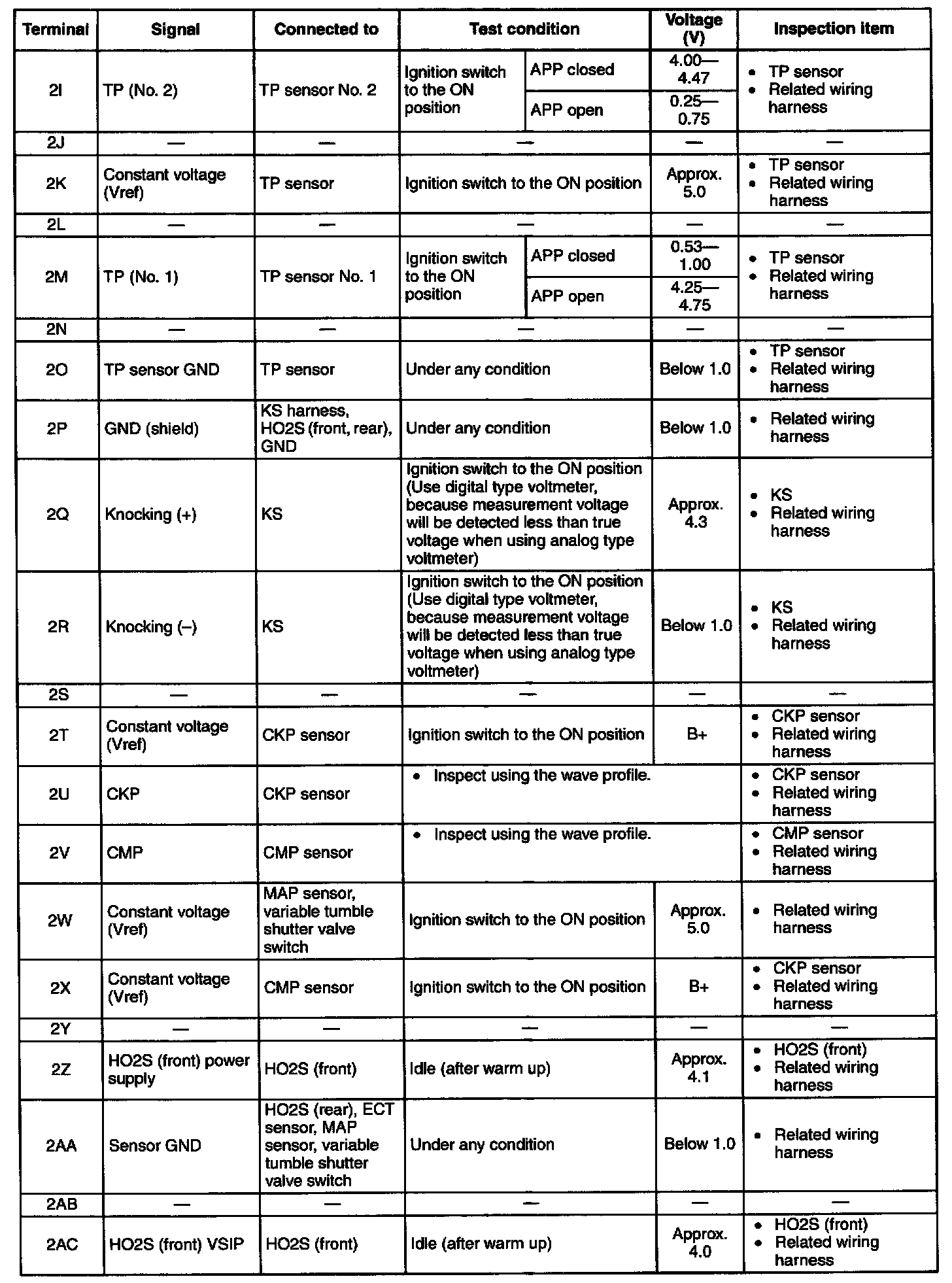 NOTE: The PCM terminal voltage can vary with the conditions when measuring and changes due to aged deterioration on the vehicle, causing false diagnosis. Therefore determine comprehensively where the malfunction occurs among the input systems, output systems, and the PCM.