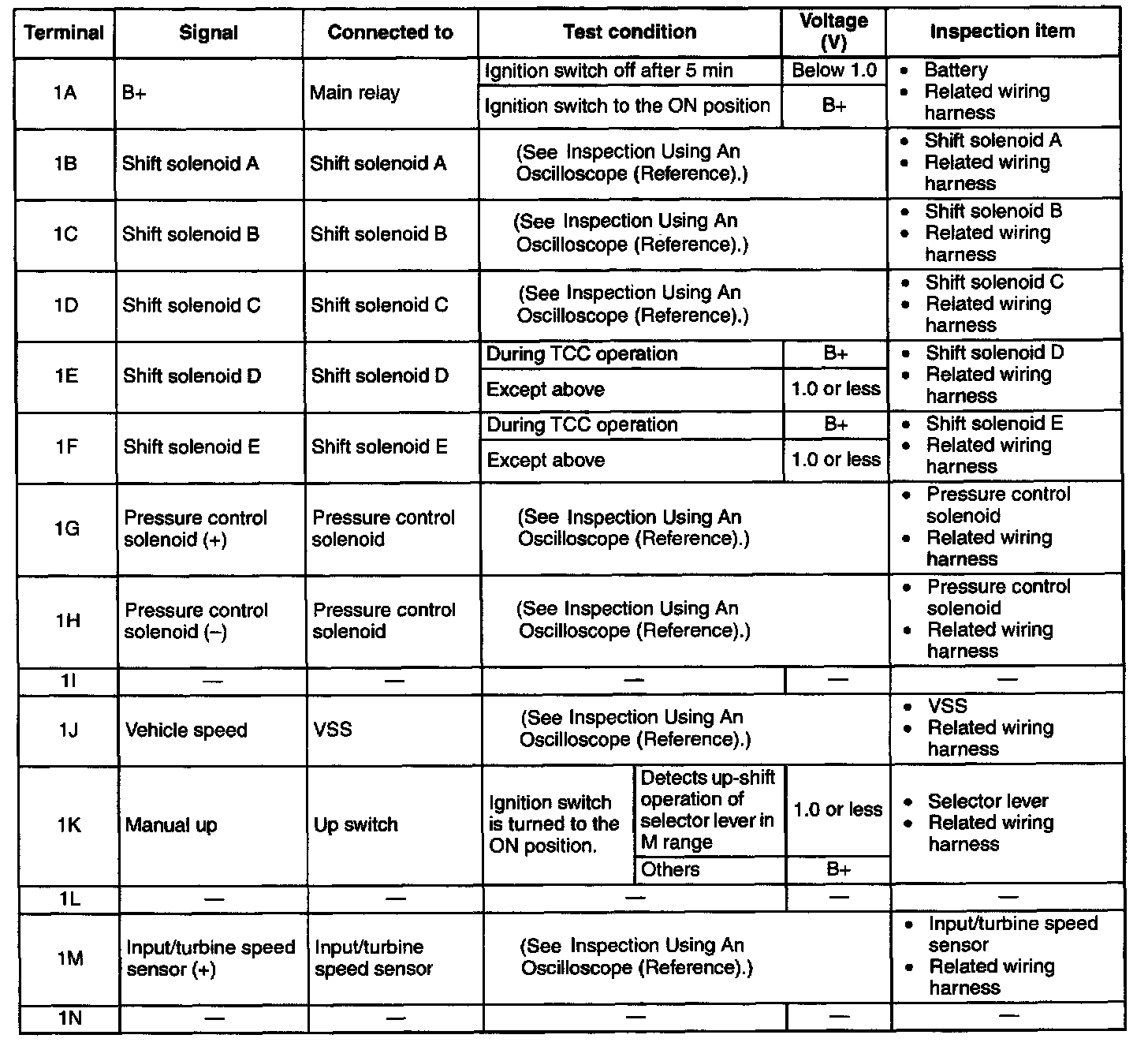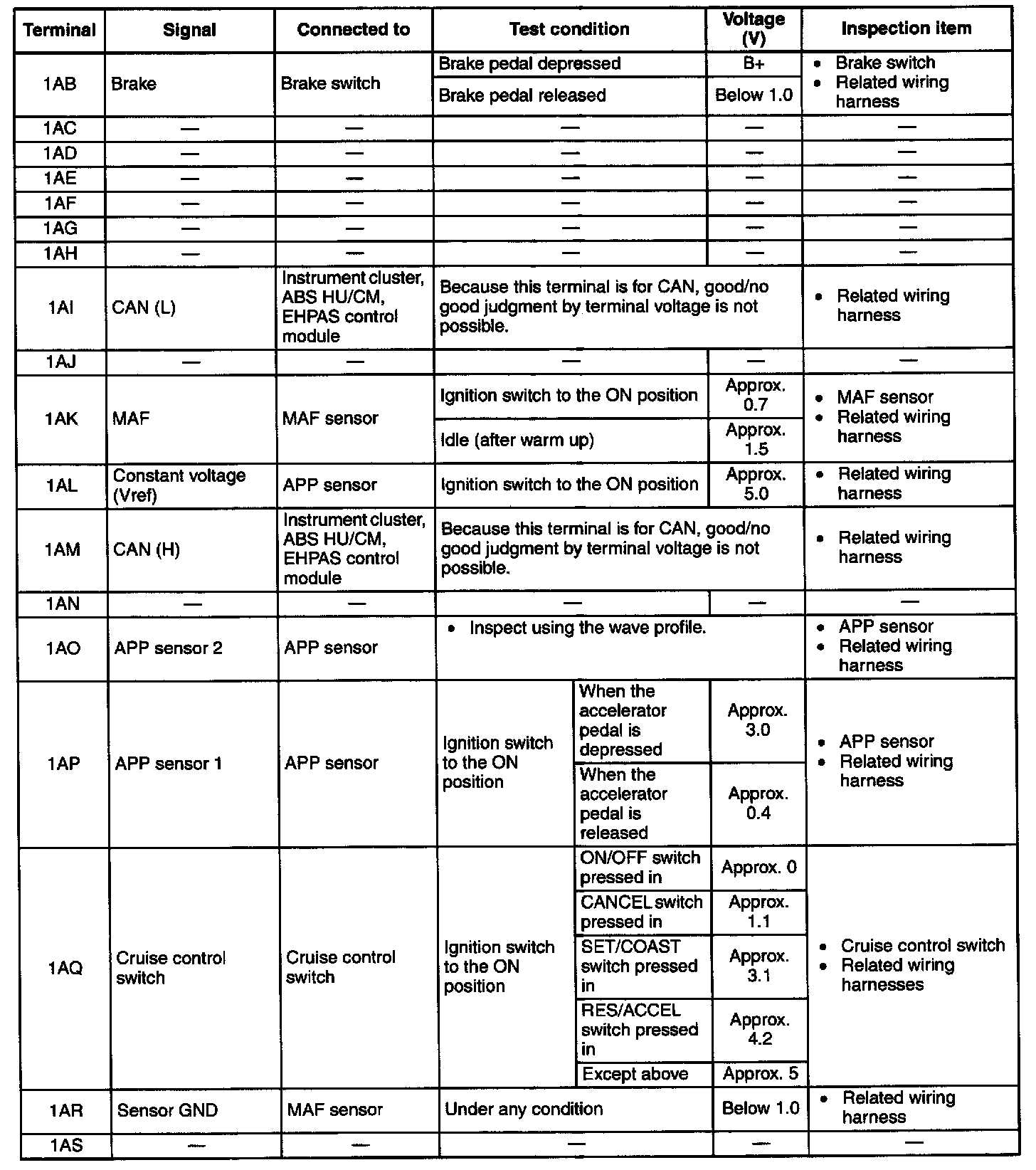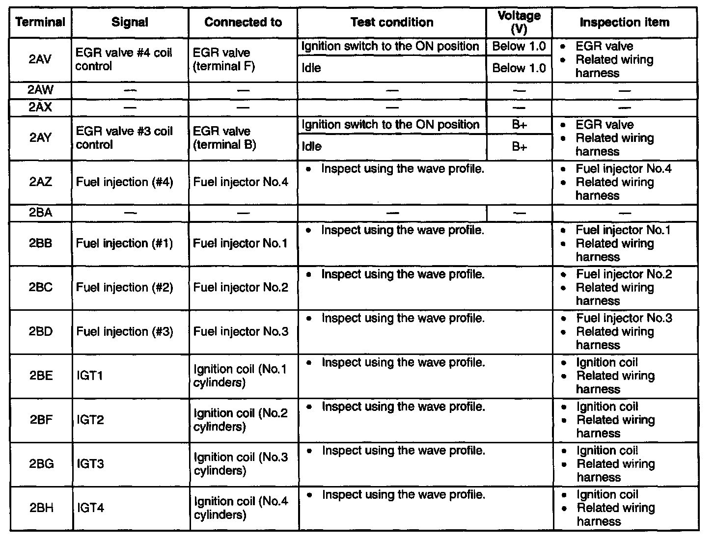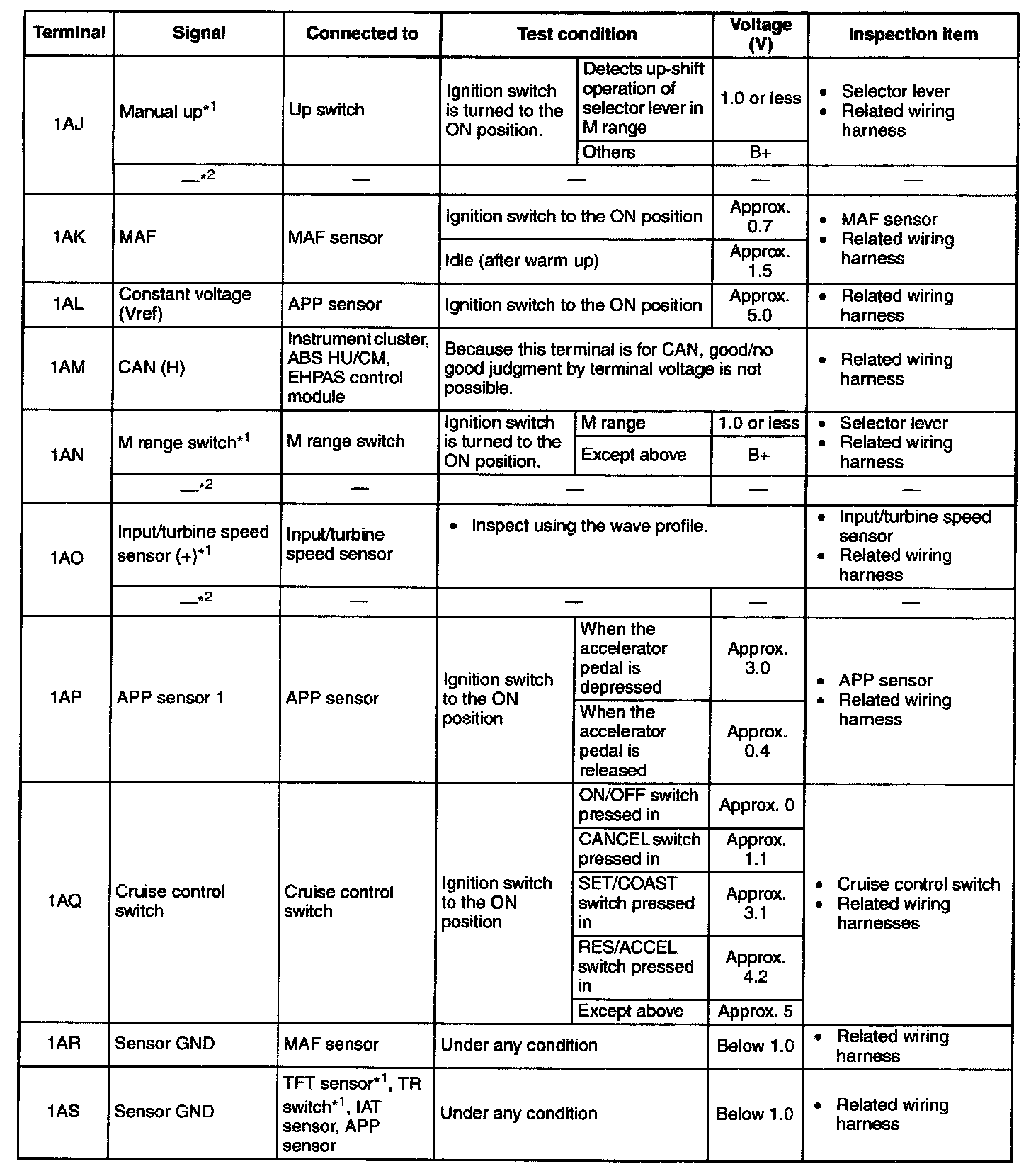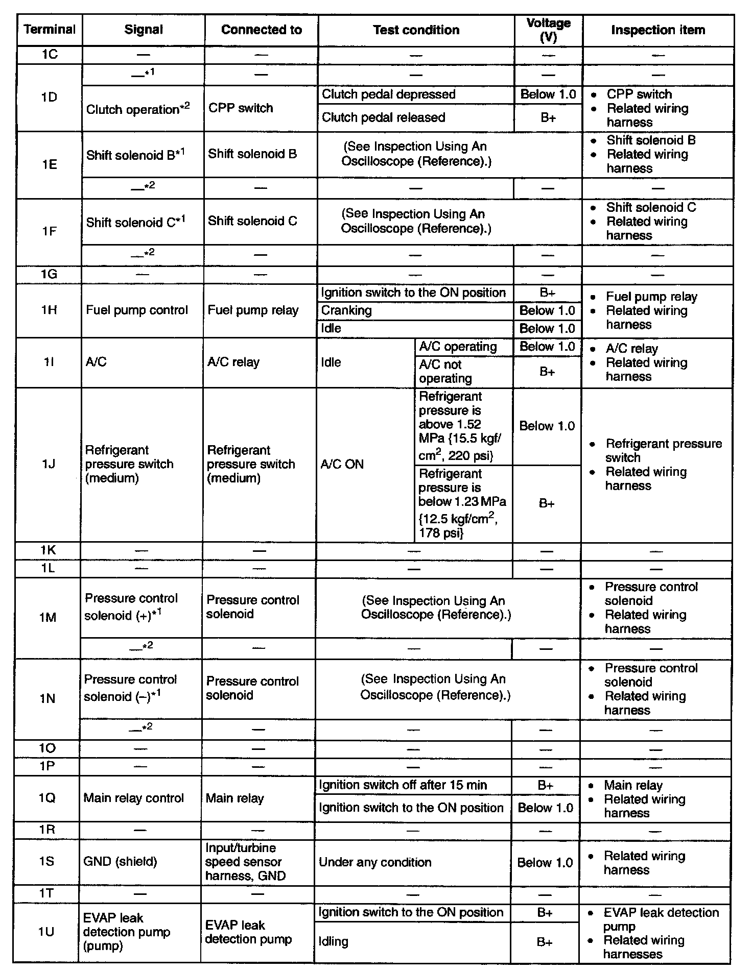 NOTE: The PCM terminal voltage can vary with the conditions when measuring and changes due to aged deterioration on the vehicle, causing false diagnosis. Therefore determine comprehensively where the malfunction occurs among the input systems, output systems, and the PCM.