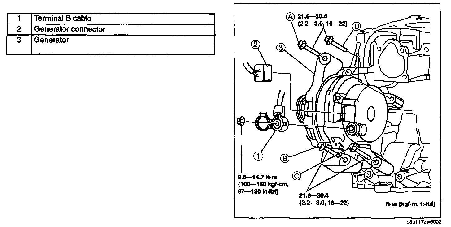 GENERATOR REMOVAL/INSTALLATION [LF, L3]WARNING: When the battery cables are connected, touching the vehicle body with generator terminal B will generate sparks. This can cause personal injury, fire, and damage to the electrical components. Always disconnect the battery negative cables before performing the following operation.