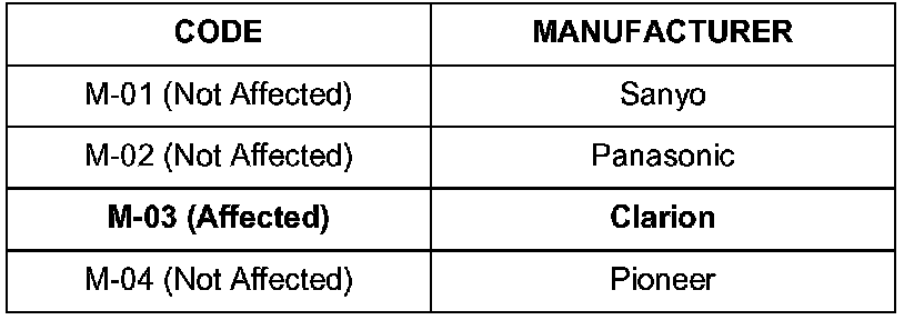 c. Press and hold POWER ON/OFF knob, then press Preset # 5 button for more than 3 seconds. The information/radio display will show the manufacturer as a code. Refer to the table below.