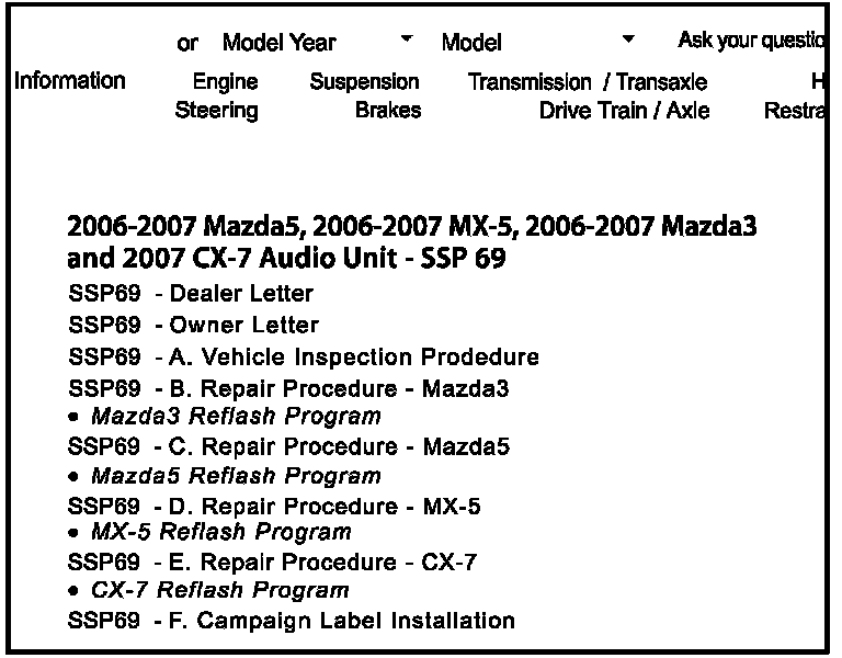 4. When the SSP / Recall page opens, locate "2006-2007 Mazda5, 2006-2007 MX-5, 2006-2007 Mazda3 and 2007 CX-7 Audio Unit - SSP 69." This includes the PDF files for the SSP Instructions as well as the reflash software and any support documentation.