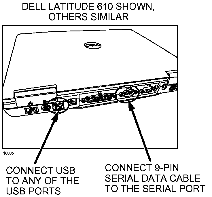 2. Connect 9-pin serial data cable and USB cable from flashing device to ports located on rear of computer (Dell Latitude 610 laptop shown, others similar).
