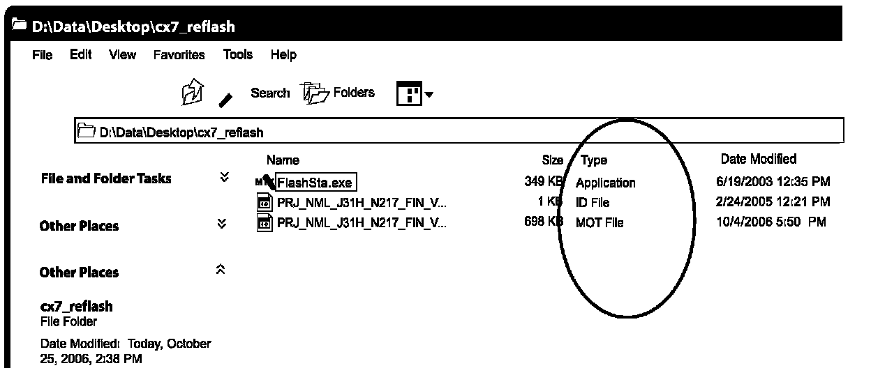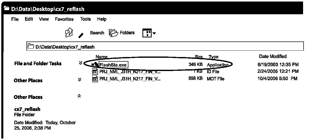 8. Click "Refer" and then specify the software program file for rewriting according to the table. Refer is similar to the "Browse" function in most programs. This will enable you to search for the correct file for the program. The file will be located in the cx7_reflash folder located in the same folder the reflash program (Flashsta.exe) is located on the desktop. Identify the file with ".mot" extension (MOT file type).