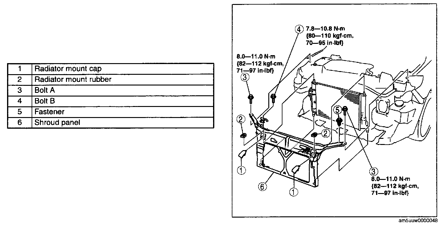 SHROUD PANEL REMOVAL/INSTALLATIONCAUTION: Because the shroud panel is installed to the front bumper reinforcement, support the shroud panel using a jack before removing the front bumper reinforcement so as not to apply excessive force to the shroud panel.