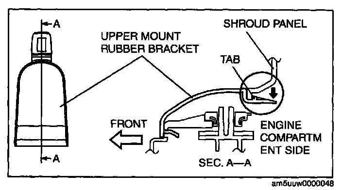 1. Remove the upper mount rubber bracket while pressing down the upper mount rubber bracket tab in the direction of the arrow.