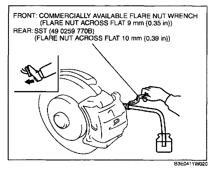 4. While the brake pedal is depressed, the other should loosen the bleeder screw using the SST or any commercially available flare nut wrench, drain out any fluid containing air bubbles, and tighten the bleeder screw.