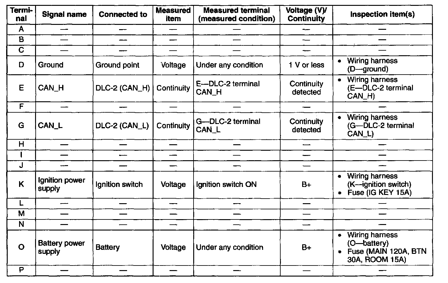 3. Attach the tester lead to the underside of the control module connector and inspect the voltage and continuity according to the Terminal Voltage Table (Reference).