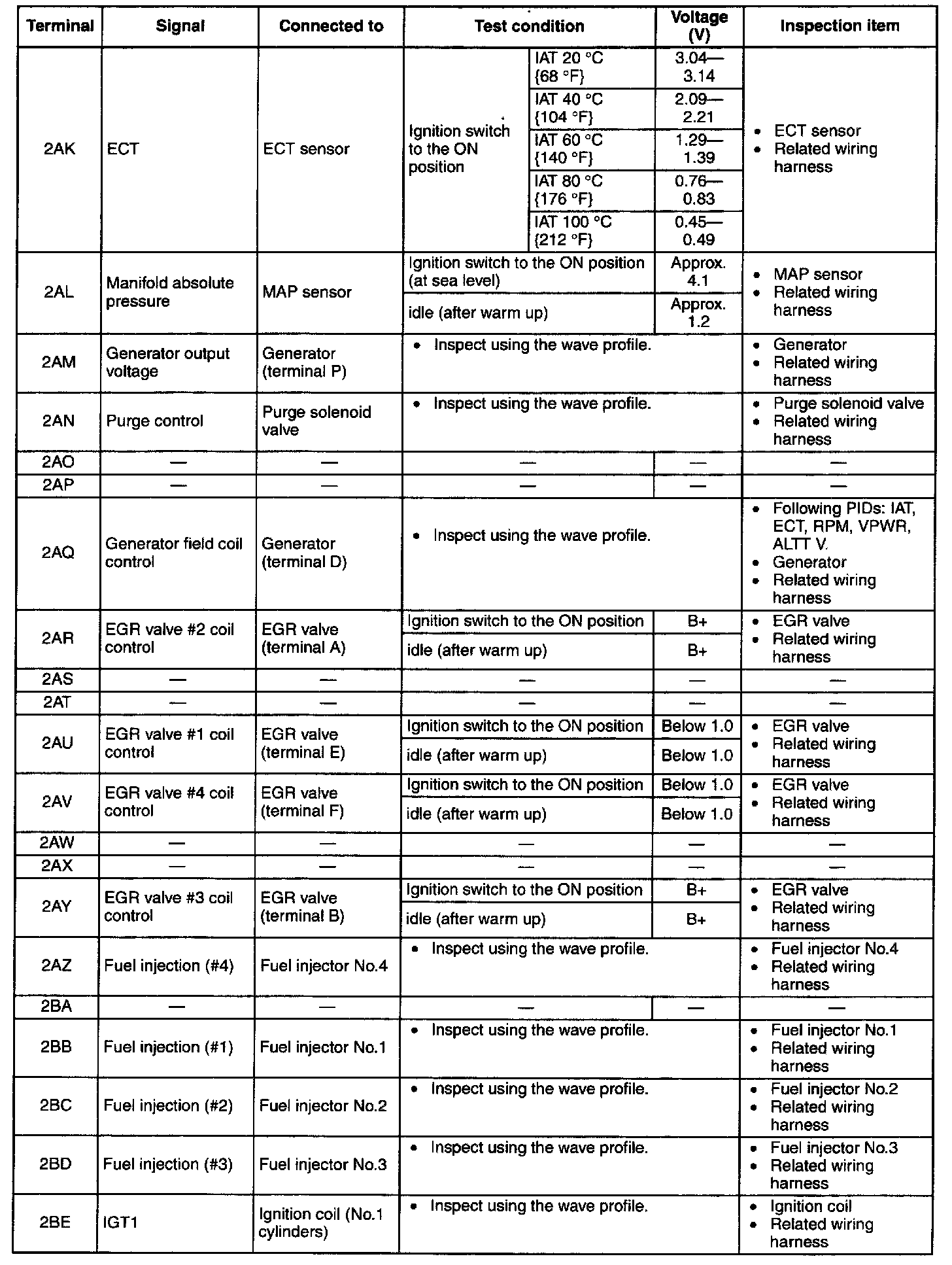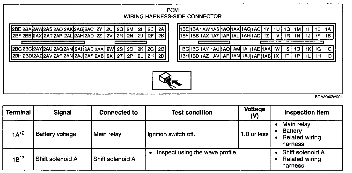 NOTE: The PCM terminal voltage can vary with the conditions when measuring and changes due to aged deterioration on the vehicle, causing false diagnosis. Therefore determine comprehensively where the malfunction occurs among the input systems, output systems, and the PCM.