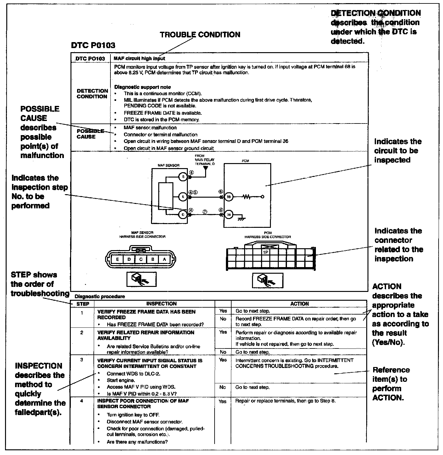 - DTC troubleshooting flow shows diagnostic procedures, inspection methods, and proper action to take for each DTC.
