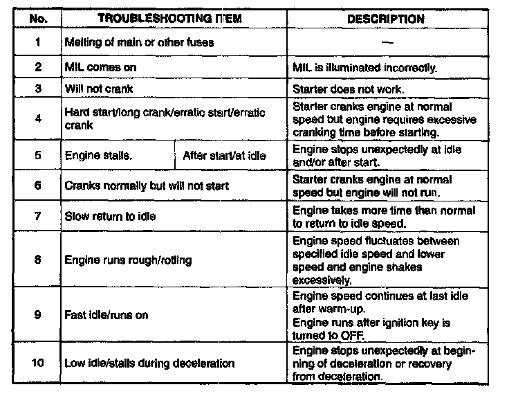 - The appropriate diagnostic inspection relating to malfunction cause as specified the symptoms can be selected by looking down the diagnostic inspection column of the chart.